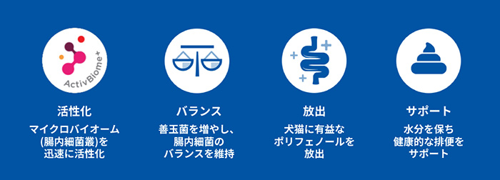 ヒルズ独自の繊維ブレンドが腸内細菌に栄養を与えることで、4つの特長を発揮します。