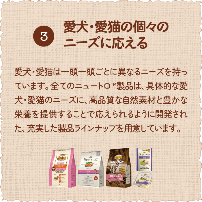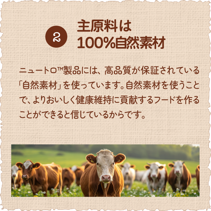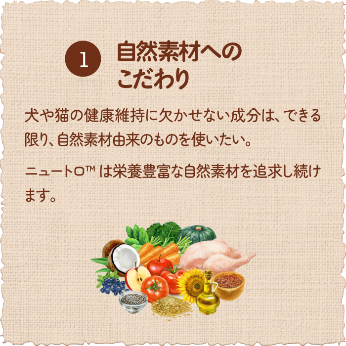 ニュートロが使用するのは、生産者まで厳選した自然素材。素材には自然の恵みがたっぷりと詰まっています。素材のおいしさを引き出すさまざまな工夫で、愛犬・愛猫たちを夢中にさせる「素材本来のおいしさ」を実現したフードが生まれます。
