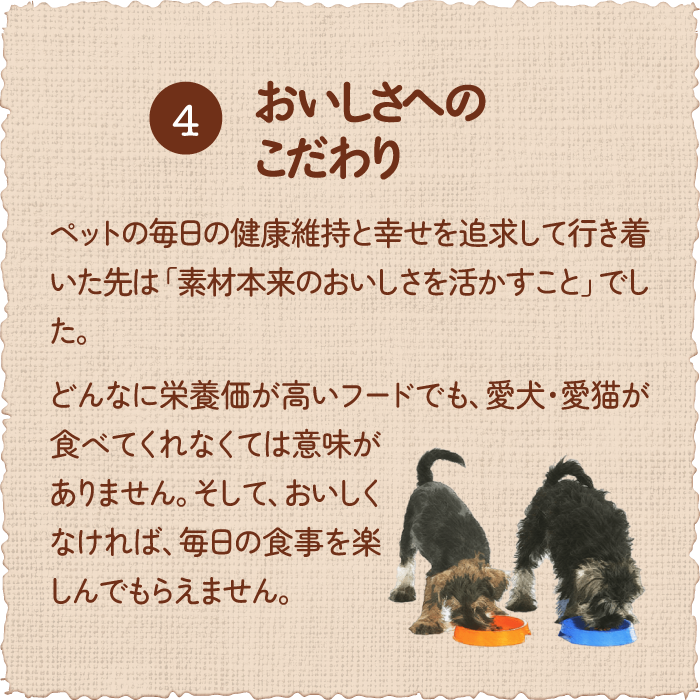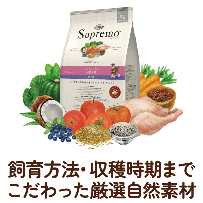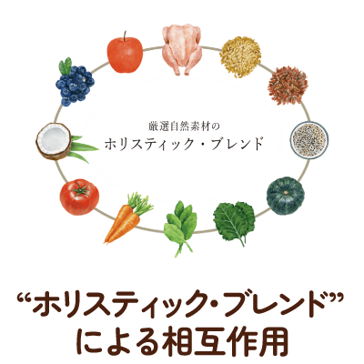 栄養豊富な厳選自然素材をたっぷりと使い(10種類以上)、最適にブレンドすることで、抜群のおいしさを引き出し、さらに栄養素としての働きを高め合う“ホリスティック・ブレンド”が愛犬の健康維持をサポートします。