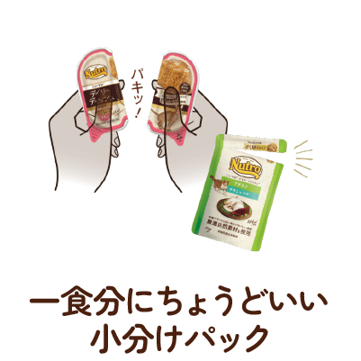 少量ずつ食べたい、香りで味を判断する、食べ飽きがち、冷たい食事を好まないなどの猫の食性に配慮した、猫の食事一回分にちょうどいい小分けパックで、たっぷりの肉や魚などの厳選自然素材のフレッシュなおいしさが毎食楽しめる、猫が嬉しいウエットフードです。