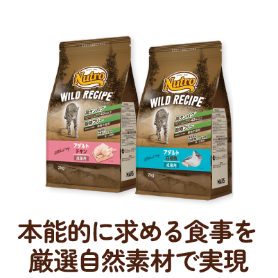 ニュートロ™ ワイルド レシピ™ は、肉食の猫が、野生の頃から食べている食事に着目。愛猫が本能的に求める高タンパクで穀物を使わない食事を、高品質な厳選自然素材で実現。