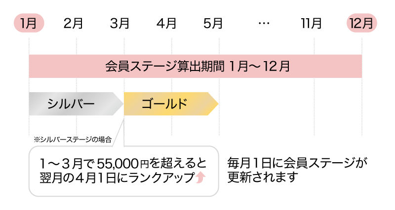 また、期間中に次のステージ基準に達した場合は、翌月1日からステージがランクアップし、より多くのポイントを獲得いただけます。