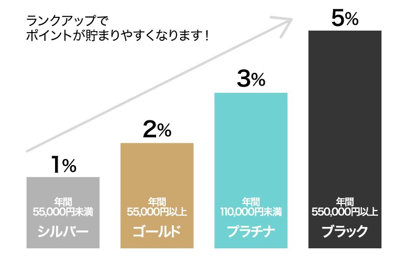 会員登録後は、年間のお買い物金額に応じて会員ランクが決まり、ランクに応じてポイント付与率が変わります。