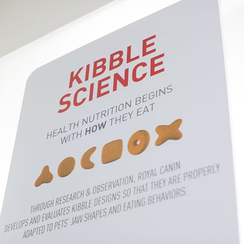 ロイヤルカナンでは、犬や猫の品種ごとの顎の形や食べ方に合わせ、科学と観察に基づいてキブルを設計。粒の形や密度、香りや口当たり、咀嚼による歯のケアや満腹感、消化のしやすさまで考慮し、嗜好性と栄養吸収を両立したフードを開発しています。
