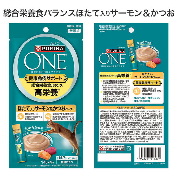 (1)ネスレ ピュリナ ワン キャット おやつ 健康免疫サポート 総合栄養食バランス 高栄養 成猫用 ほたて入りサーモン&かつおペースト 56g(14g×4本)