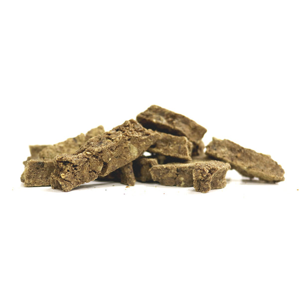 ベニソンの生肉と内臓に濃厚で豊かな風味のパルメザンチーズを混ぜた、チーズの香りがたまらないおやつです。嗜好性が高いので、小さく砕いてフードのトッピングにもおすすめです。