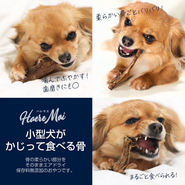 「骨」だけど、小型犬や猫が食べやすいように柔らかく希少な部位を用意しました。余計なものは混ぜず原料をそのまま乾燥させたからヘルシーで、食物アレルギーにも配慮。噛むことで歯石の沈着を防ぎ、口臭の軽減が期待できるおやつです。
