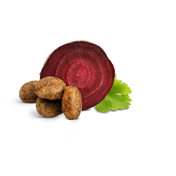 ポルトリープロテイン*(18%)、コーン粉、コーン、米、ポテト*、油脂類、ライスプロテイン*、サーモンミール(4%)、グリーブス(脱脂ハラミ肉)、加水分解プロテイン*、リグノセルロース、ビートファイバー*、全卵パウダー、塩化カリウム、アップルポマス*(0.3%)、サッカロマイセスセレビシエ*、塩化ナトリウム、キャロット*(0.25%)、チコリパウダー(0.15%)、海藻*、ユッカシジゲラ*(0.15%)、亜麻仁(0.12%)、えんどう豆フレーク(0.1%)、ビーツパウダー、イースト抽出物*(0.06%)、緑イ貝*(0.05%)、グルコサミン(0.05%)、ミルクシスル、アーティチョーク、タンポポ、ショウガ、カンバ葉、ネトル、カモミール、コリアンダー(0.006%)、ローズマリー、セージ、リコリス根、タイム、ビタミン類(ビタミンA、ビタミンD3、ビタミンE、ビタミンB1、ビタミンB2、ビタミンB6、ビオチン、Dパントテン酸カルシウム、ナイアシン、ビタミンB12、ビタミンC、葉酸)、ミネラル類(鉄、銅、亜鉛、マンガン、ヨウ素酸カルシウム、亜セレン酸ナトリウム)その他栄養素(DLメチオニン、タウリン、コリン、L-カルニチン)、天然由来トコフェロール(酸化防止剤として)(*乾燥)