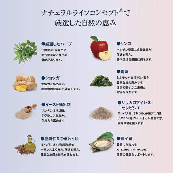 ラムプロテイン*(21%)、米粉(21%)、コーン粉、コーン、ライスプロテイン*(9%)、ポルトリー脂肪、加水分解レバー、ビートファイバー*、ひまわり油、アップルポマス*(1%)、菜種油、乾燥全卵、塩化ナトリウム、サッカロマイセス・セレビシエ*、塩化カリウム、海藻*(0.15%)、亜麻仁(0.15%)、ミルクシスル、アーティチョーク、タンポポ、ショウガ、カンバ葉、ネトル、カモミール、コリアンダー、ローズマリー、セージ、リコリス根、タイム(ハーブ:0.14%)*、緑イ貝*(0.05%)、イースト抽出物*、ビタミン類(ビタミンA、ビタミンD3、ビタミンE、ビタミンB1、ビタミンB2、ビタミンB6、ビオチン、Dパントテン酸カルシウム、ナイアシン、ビタミンB12、コリン、葉酸)、ミネラル類(鉄、銅、亜鉛、マンガン、ヨウ素酸カルシウム、亜セレン酸ナトリウム)、天然由来トコフェロール(酸化防止剤として) (*乾燥)