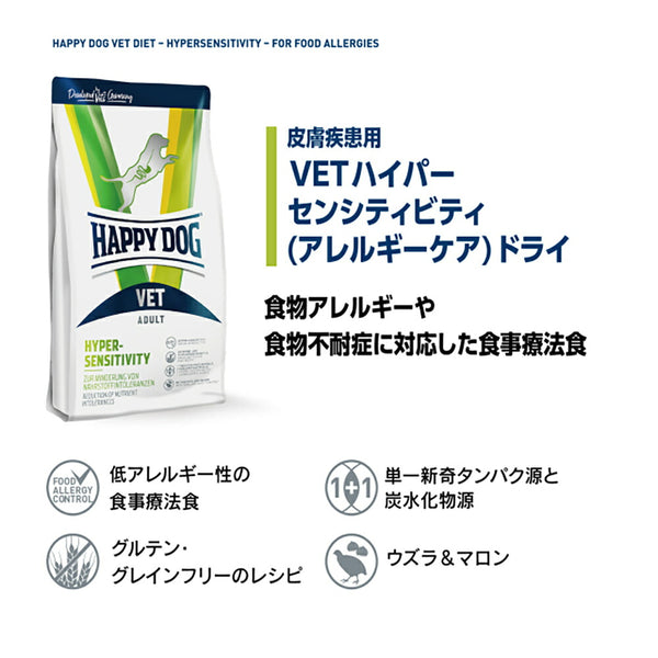 HAPPY DOG VETハイパーセンシティビティ(アレルギーケア) ドライは、食物アレルギーの除去食として、また、食物不耐症の症状を軽減することを目的として使用できる食事療法食です。高消化性のタンパク源「ウズラ」と、炭水化物源「マロン」は、食物アレルギーの除去食として適しているだけでなく嗜好性も高いので、毎日美味しく食べることで健康ケアできます。食物アレルギー症状に伴う皮膚や消化器への負担軽減に配慮して、健康な皮膚の再生と新陳代謝を促す栄養素を豊富に含み胃腸に優しい原材料を厳選したグレインフリーのレシピです。