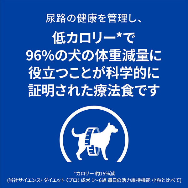 この製品は、ミネラルを調整し、ストルバイト尿石の溶解時の管理及びストルバイトとシュウ酸カルシウム尿石の形成を抑制します。また、栄養素の調整により、肥満に伴う併発疾患など、10種類の症状に対応した減量フードです。