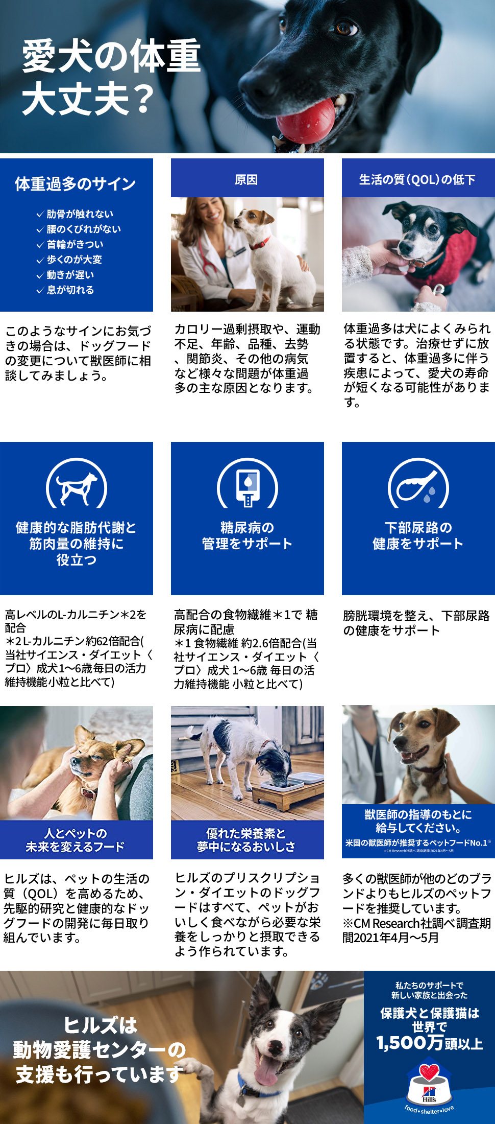 生まれつき体重が増加しやすい犬もいます。ほんの少し体重が増えるだけでも、ペットと家族が遊ぶ時間が減少してしまったり、関節への負担増などによって、生活の質(クオリティ・オブ・ライフ)が下がってしまうと言われています。そんなペットのために、ヒルズの栄養学者と獣医師が開発したのが、消化、糖尿病・体重管理に対応した特別療法食 プリスクリプション・ダイエット 犬用 w/d ダブリューディー 小粒です。この製品は、体重管理と繊維が必要な状態に配慮し、低脂肪・低カロリー・高食物繊維に調整され、繊維反応性疾患に対応することが科学的に証明されたフードです。