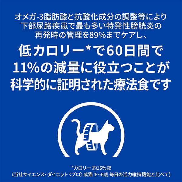 この製品は、ストレスの多い環境に配慮し、猫下部尿慮疾患(特発性膀胱炎、ストルバイト及びシュウ酸カルシウム尿石症など)の管理に役立ちます。また独自の原材料配合により60日間で11%減量に役立つことが科学的に証明されたフードです。