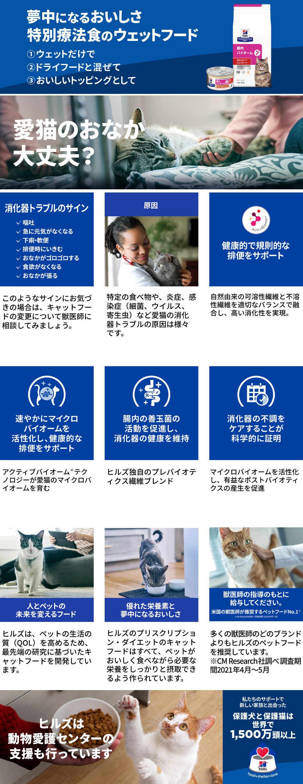 ヒルズの栄養学者と獣医師は、独自のプレバイオティクスブレンドであるアクティブバイオームテクノロジーを採用したプリスクリプション・ダイエット 〈猫用〉腸内バイオームコンフォートを開発しました。腸内バイオームコンフォートは、最短24時間で健康で規則的な排便をサポートし、再発リスクの低減に役立つことが科学的に証明されています。