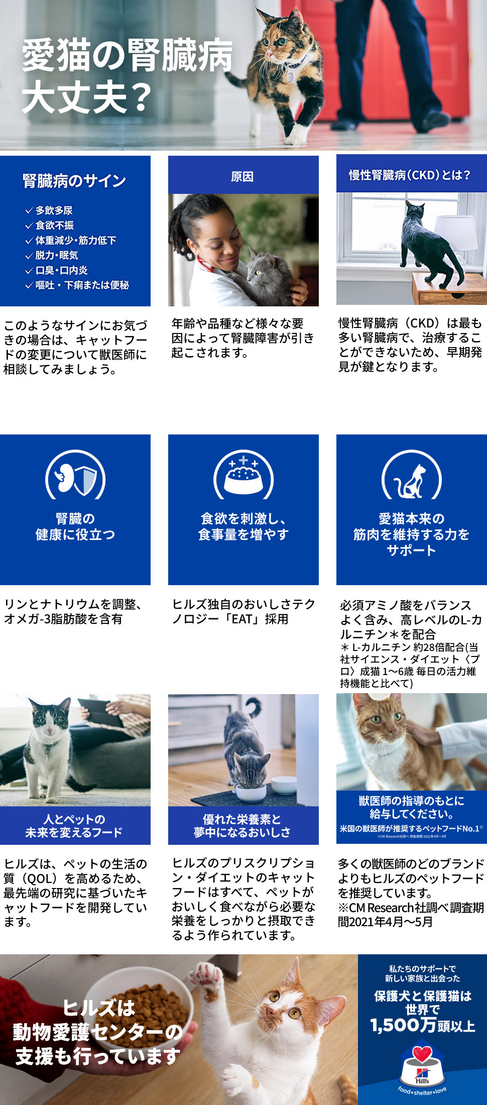 ヒルズの栄養学者と獣医師が開発したプリスクリプション・ダイエット 猫用 k/d ケイディー早期アシストは、リンやナトリウムなどを早期の慢性腎臓病の猫のために調整された、あなたの愛猫の腎臓ケアを早期からサポートする特別療法食です。k/d 早期アシストは、早期の慢性腎臓病(CKD)の猫の腎機能マーカーを安定させることが科学的に証明されたフードです。また新たにベタインとヒルズ独自の繊維ブレンド「アクティブバイオームキドニーディフェンス」を採用することで、マイクロバイオーム(腸内細菌叢)を活性化し、腎臓の健康に貢献します。