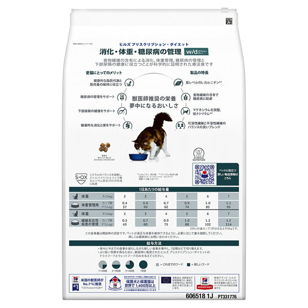 そんなペットのために、ヒルズの栄養学者と獣医師が開発したのが、消化と体重管理に特化した特別療法食 プリスクリプション・ダイエット 猫用 w/d ダブリューディーです。この製品は、体重管理と繊維が必要な状態に配慮し、低カロリーと高食物繊維で、繊維反応性疾患に対応することが科学的に証明されたフードです。
