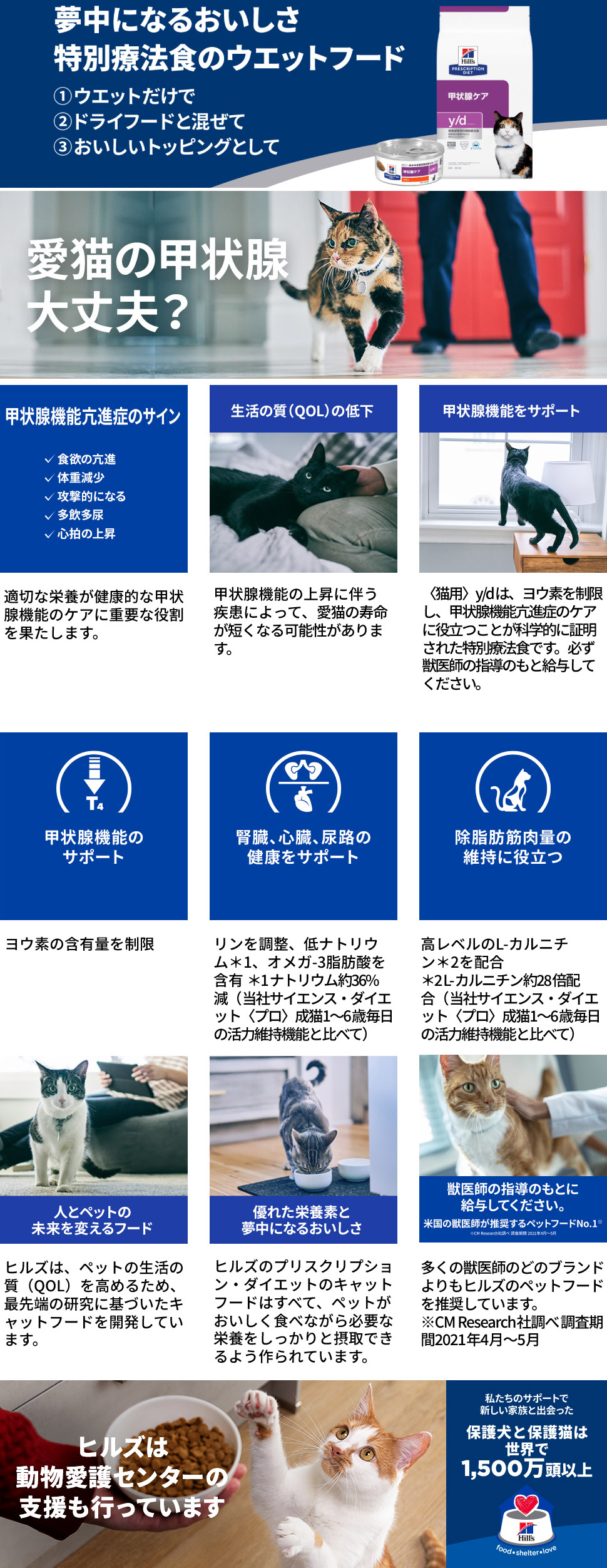 ヒルズのプリスクリプション・ダイエット 猫用 y/d ワイディーは、甲状腺の健康を安全、効果的、簡単に管理できる特別療法食です。ヨウ素を制限し、3週間の単独給与で甲状腺機能亢進症のケアに役立つことが科学的に証明された特別療法食です。