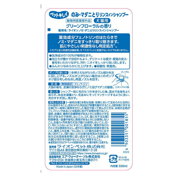 ライオン ペットキレイ のみとりリンスインシャンプー愛犬・愛猫用 グリーンフローラルの香り ポンプ 550ml (犬猫兼用)