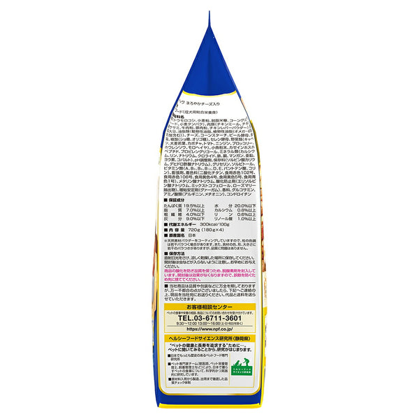 穀類(トウモロコシ、小麦粉、脱脂米糠、コーングルテンフィード、小麦タンパク)、肉類(チキンミール、チキン、鶏ササミ、牛肉粉、豚肉粉、チキンレバーパウダー)、脱脂大豆、油脂類(動物性油脂、植物性油脂(オメガ-6脂肪酸含む))、チーズ、コーンスターチ、ビール酵母、食塩、糖類(ショ糖、オリゴ糖)、セレン酵母、野菜類(キャベツ、大麦若葉、カボチャ、トマト、ニンジン、ブロッコリー、ホウレンソウ、モロヘイヤ)、小魚粉末、カゼインホスホペプチド、プロピレングリコール、ミネラル類(カルシウム、リン、ナトリウム、クロライド、鉄、銅、マンガン、亜鉛、ヨウ素、コバルト)、pH調整剤、保存料(ソルビン酸カリウム、デヒドロ酢酸ナトリウム)、グリセリン、ソルビトール、ビタミン類(A、B2、B6、B12、D、E、パントテン酸、コリン)、膨張剤、着色料(二酸化チタン、食用赤色102号、食用赤色106号、食用黄色4号、食用黄色5号、食用青色1号)、メタリン酸ナトリウム、酸化防止剤(エリソルビン酸ナトリウム、ミックストコフェロール、ローズマリー抽出物)、増粘安定剤(グァーガム)、香料、グルコサミン、アミノ酸類(アルギニン、メチオニン)、コンドロイチン