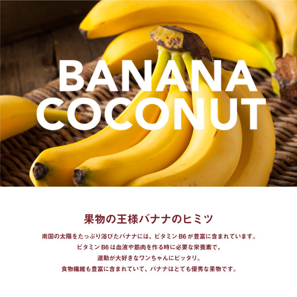 【果物の王様バナナのヒミツ】南国の太陽をたっぷり浴びたバナナには、ビタミンB6が豊富に含まれています。ビタミンB6は血液や筋肉を作る時に必要な栄養素で、運動が大好きなワンちゃんにピッタリ。食物繊維も豊富に含まれていて、バナナはとても優秀な果物です。