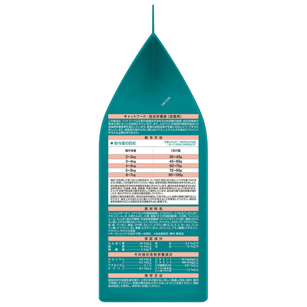 フィッシュ(サーモン、ツナ)(オメガ3脂肪酸源)、とうもろこし、とうもろこしたんぱく、チキンミール、米、小麦たんぱく、小麦、鶏脂(オメガ6脂肪酸源)、大豆粉、フィッシュミール、たんぱく加水分解物、可溶性食物繊維(プレバイオティクス源)、酵母(βグルカン源)、ミネラル類(カルシウム、リン、カリウム、ナトリウム、クロライド、マグネシウム、鉄、銅、マンガン、亜鉛、ヨウ素、セレン)、ビタミン類(A、D、E、K、B1、B2、パントテン酸、ナイアシン、B6、葉酸、ビオチン、B12、コリン、C)、アミノ酸類(メチオニン、タウリン)、カラメル色素