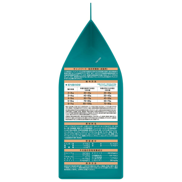 チキン、とうもろこしたんぱく、小麦たんぱく、チキンミール、とうもろこし、米、大豆粉、小麦、食物繊維、鶏脂(オメガ6脂肪酸源)、フィッシュミール(オメガ3脂肪酸源)、たんぱく加水分解物、可溶性食物繊維、酵母(βグルカン源)、ミネラル類(カルシウム、リン、カリウム、ナトリウム、クロライド、マグネシウム、鉄、銅、マンガン、亜鉛、ヨウ素、セレン)、ビタミン類(A、D、E、K、B1、B2、パントテン酸、ナイアシン、B6、葉酸、ビオチン、B12、コリン、C)、アミノ酸類(メチオニン、タウリン、L-カルニチン)、カラメル色素