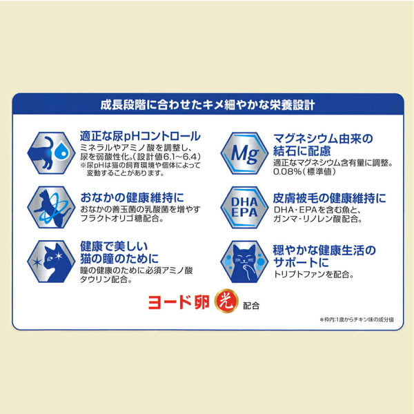 マグネシウムとカルシウムの適正バランス、尿pHのコントロール、高い消化吸収性など、最新の臨床栄養学の成果をフルに盛り込んで、それぞれの成長段階に最もふさわしい栄養設計をしています。ライフステージに加え、猫の飼育環境などにもキメ細やかに対応します。