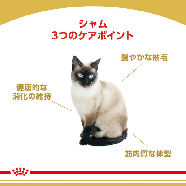 シャムは筋肉質な細身の身体が特徴の猫種で、健康な筋肉の維持に配慮が必要です。また、消化性の高いフードであることも必要です。適切なタンパク質量とカロリー含有量に調整し、消化性の高いタンパク質を配合するなど、ロイヤルカナン独自の猫種ごとに最適な栄養バランスで愛猫の健康をサポートします。