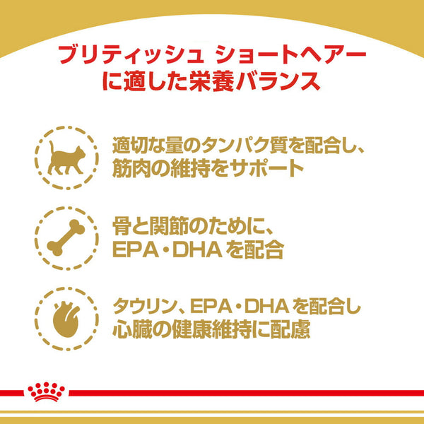 ブリティッシュ ショートヘアーはがっしりと力強く、筋肉質な体型です。また、骨と関節の負担に配慮が必要です。タンパク質の量を適切に調整し、オメガ3系不飽和脂肪酸(EPA・DHA)を配合するなど、ロイヤルカナン独自の猫種ごとに最適な栄養バランスで愛猫の健康をサポートします。