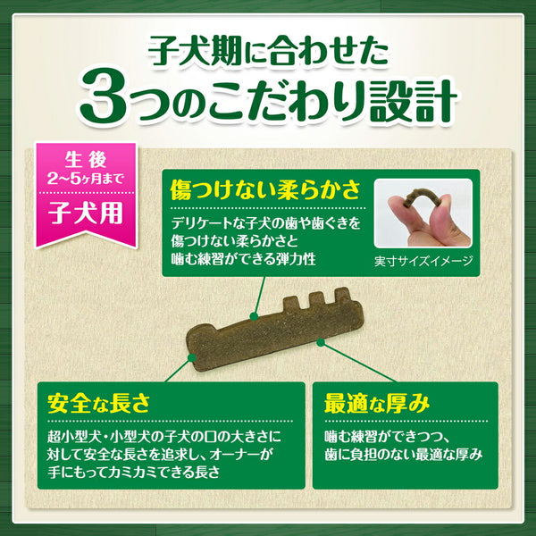 生後2カ月から、おいしく歯みがきトレーニング!成犬期に、噛むことで歯垢・歯石の沈着を抑制するデンタルケアができるように、子犬期から噛むデンタルケアに慣れさせることが大切です。本製品を手に持ってよく噛ませてあげることで、子犬期からの歯みがきトレーニングと、愛犬との楽しいコミュニケーションができます。