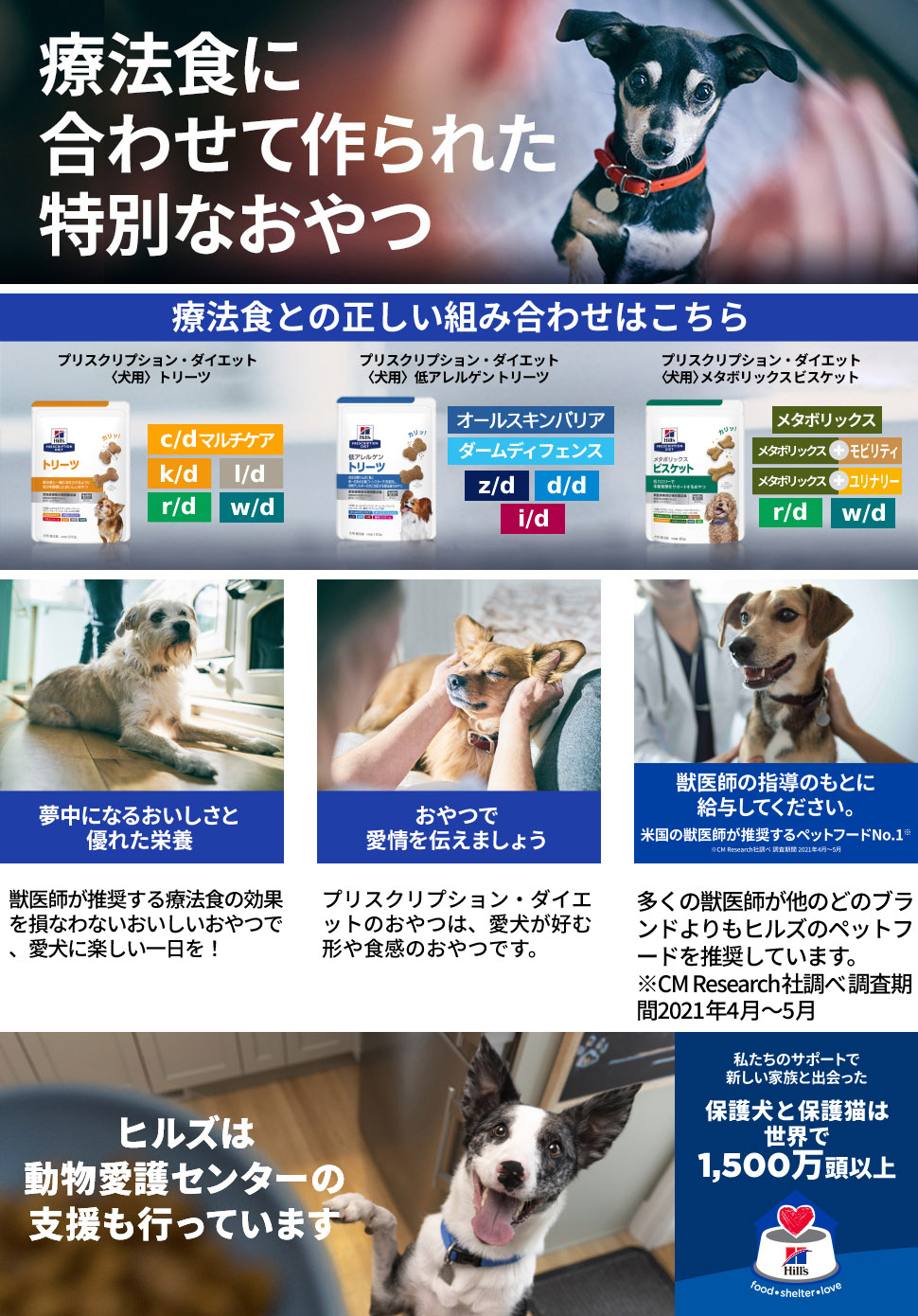 犬用 トリーツは、プリスクリプション・ダイエット 製品を給与している犬へ与えることができるよう成分を調整したおやつとしての特別療法食です。必ず獣医師の指導のもとに給与を開始し、給与してください。プリスクリプション・ダイエット 犬用 c/d マルチケア、k/d 、l/d 、r/d 、w/d 製品を給与している犬へおやつとして与えることができます。