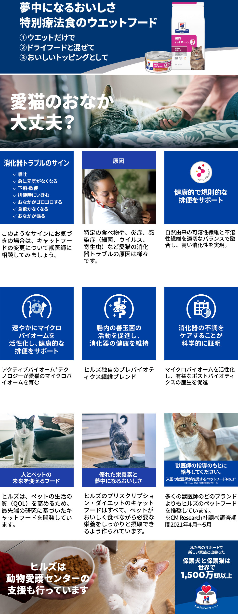 愛猫のお腹の健康はストレスを含む多くの事柄によって悪影響を受ける可能性があり、愛猫のお腹の不調が見られるときは周りにいる人すべてにとって大変不快な状態になります。幸いなことに、ペット独自の生態系であるマイクロバイオーム(腸内細菌叢)の健康を消化ケアの根本に置くことで、繊維反応性の消化器症状に対して、革新的なフードが愛猫のお腹の健康維持をサポートすることができます。ヒルズの栄養学者と獣医師は、独自のプレバイオティクスブレンドであるアクティブバイオームテクノロジーを採用した プリスクリプション・ダイエット〈猫用〉腸内バイオームコンフォートを開発しました。最短24時間で健康で規則的な排便をサポートし、再発リスクの低減に役立つことが科学的に証明されています。