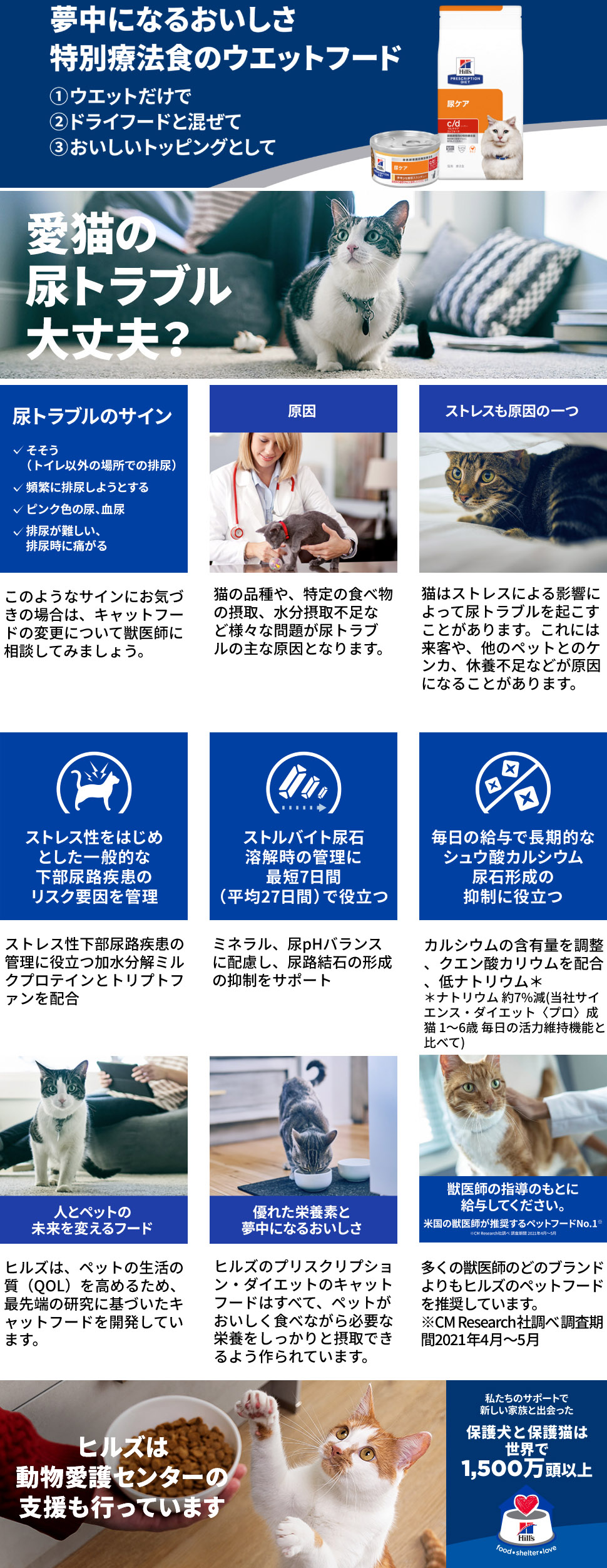 ヒルズの栄養学者と獣医師が開発したプリスクリプション・ダイエット c/d シーディーマルチケアコンフォートは、加水分解ミルクプロテイン等を配合。ストレス性下部尿路にも配慮した特別療法食です。