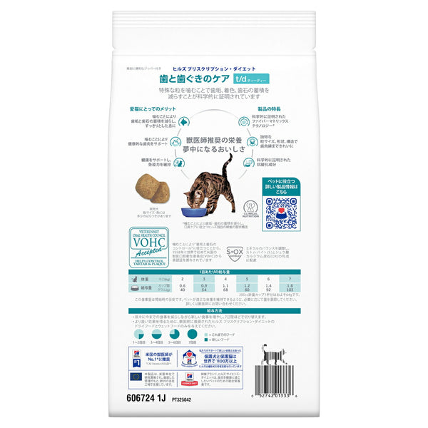 ヒルズのプリスクリプション・ダイエット 猫用 t/d ティーディーは、あなたの愛猫の歯と歯ぐきの健康をサポートする特別療法食です。t/dの特殊な粒をかむことで、歯垢、歯石の蓄積を低減することが科学的に証明されています。