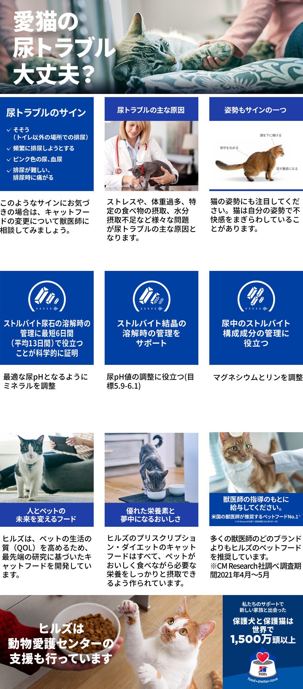 ヒルズの栄養学者と獣医師が開発したプリスクリプション・ダイエット 猫用 s/dエスディーは愛猫の尿ケアをサポートする特別療法食です。ストルバイト結石の溶解の管理に、最短6日間(平均13日間)で役に立つことが科学的に証明されています。