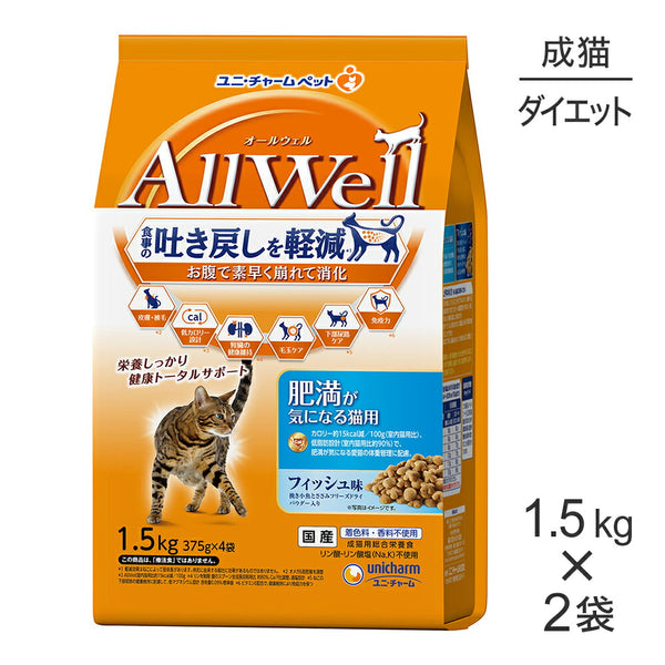 【1.5kg×2袋】ユニ・チャーム AllWell 肥満が気になる猫用 フィッシュ味 挽き小魚とささみフリーズドライパウダー入り (猫・キャット)