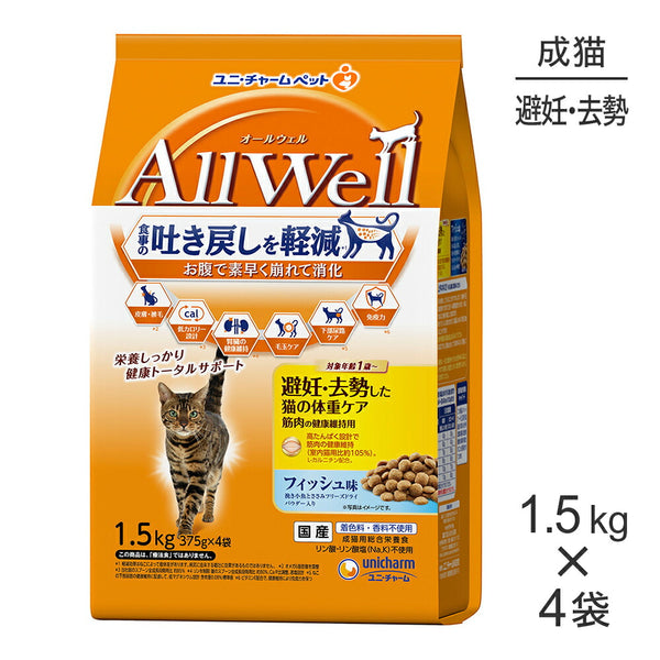 【1.5kg×4袋】ユニ・チャーム AllWell 避妊・去勢した猫の体重ケア 筋肉の健康維持用 フィッシュ味 挽き小魚とささみフリーズドライパウダー入り (猫・キャット)