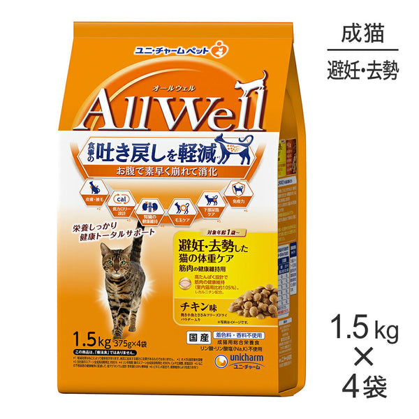 【1.5kg×4袋】ユニ・チャーム AllWell 避妊・去勢した猫の体重ケア 筋肉の健康維持用 チキン味 挽き小魚とささみフリーズドライパウダー入り (猫・キャット)