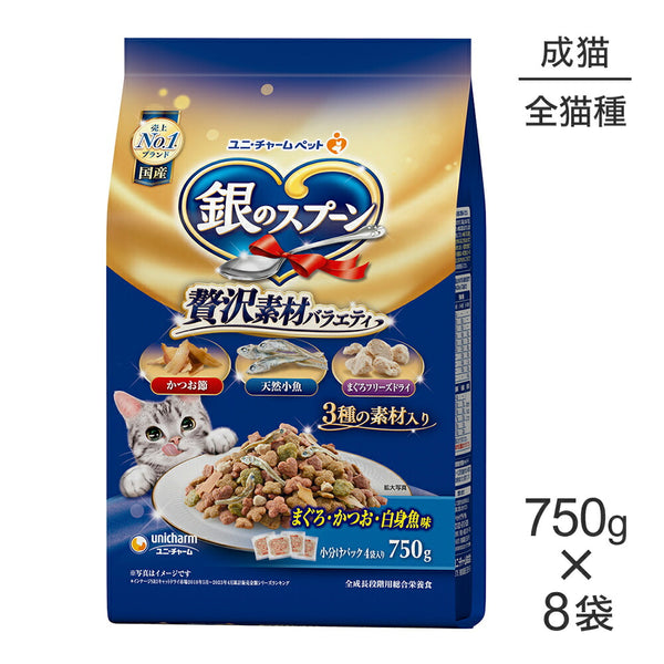 【750g×8袋】ユニ・チャーム 銀のスプーン 贅沢素材バラエティ 全年齢用 まぐろ・かつお・白身魚味 (猫・キャット)