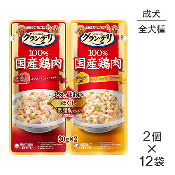 【メール便】【30g×2個×12個】ユニ・チャーム グラン・デリ 100%国産鶏肉 パウチ 2つの味わい ほぐし 成犬用 ビーフ入り&チーズ入り ウェット (犬・ドッグ)