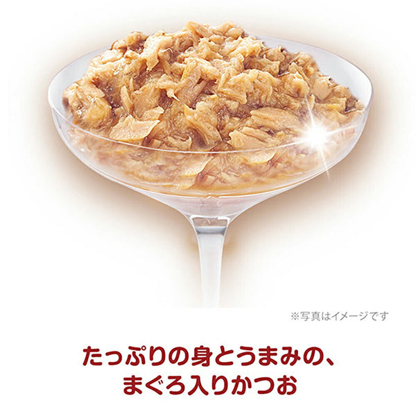 魚介類(かつお、まぐろ、フィッシュエキス)、チキンエキス、コーンスターチ、増粘多糖類、ミネラル類(Cl、K)、ビタミン類(B1、B2、B6、B12、E)