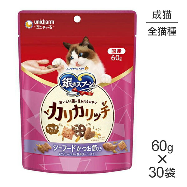 【60g×30袋】ユニ・チャーム 銀のスプーン おいしい顔が見られるおやつ カリカリッチ 成猫用 シーフード かつお節入り (猫・キャット)