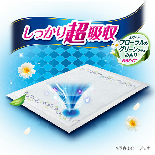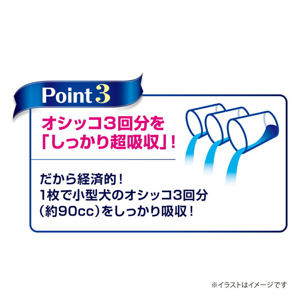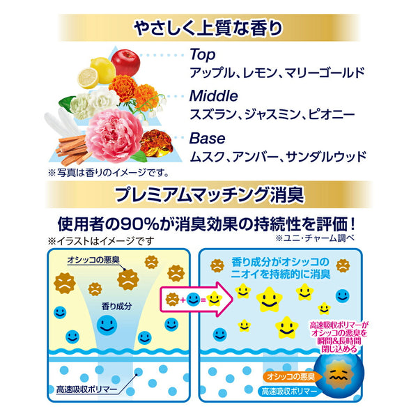 また高速吸収ポリマーがオシッコを瞬間吸収して長時間ニオイを閉じ込め、香り成分によるプレミアムマッチング消臭する香り消臭タイプ。オシッコ3回分(約90)をしっかり超吸収。