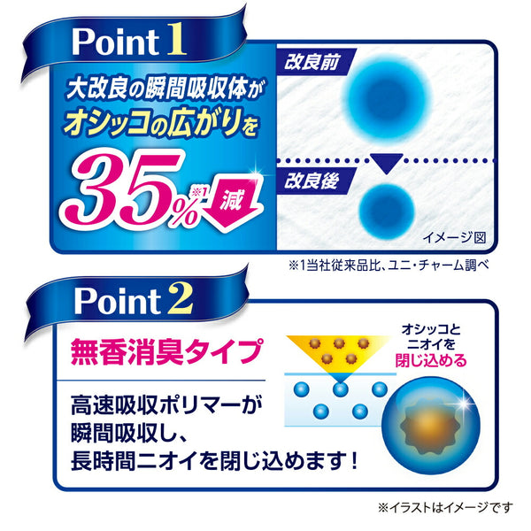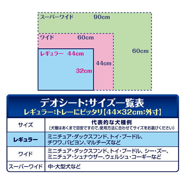 デオシート独自の高速吸収ポリマーがオシッコを瞬間吸収。だから、足ぬれ・モレを防ぎます。さらに、無香・香り2つの消臭タイプで、ニオイ安心。飼い主さまとワンちゃんの毎日の笑顔あふれ快適なトイレを目指します。