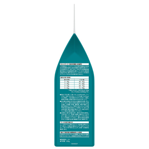 穀類(とうもろこし、とうもろこしたんぱく、小麦、米等)、肉類(チキンミール等)、動物性油脂、魚介類(まぐろ、かつお)、たんぱく加水分解物、フレーバーブレンド(かに、えび、鯛等)、ミネラル類(カルシウム、リン、カリウム、ナトリウム、クロライド、鉄、銅、マンガン、亜鉛、ヨウ素、セレン)、ビタミン類(A、E、K、B1、B2、パントテン酸、ナイアシン、B6、葉酸、ビオチン、B12、コリン)、アミノ酸類(メチオニン、タウリン)、着色料(カラメル色素、カロテノイド色素)