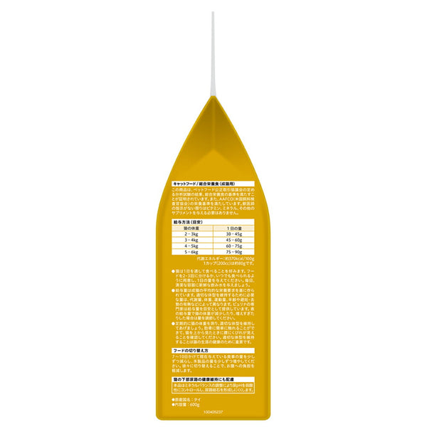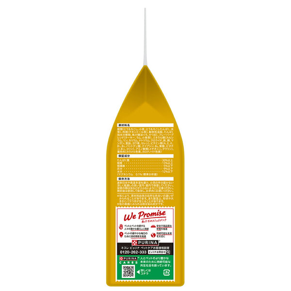 穀類(とうもろこし、小麦、とうもろこしたんぱく、米等)、肉類(チキンミール等)、動物性油脂、たんぱく加水分解物、魚介類(まぐろ、かつお)、フレーバーブレンド(ターキー、ラム、小魚等)、ミネラル類(カルシウム、リン、カリウム、ナトリウム、クロライド、鉄、銅、マンガン、亜鉛、ヨウ素、セレン)、ビタミン類(A、E、K、B1、B2、パントテン酸、ナイアシン、B6、葉酸、ビオチン、B12、コリン)、アミノ酸類(メチオニン、タウリン)、着色料(カラメル色素、カロテノイド色素)