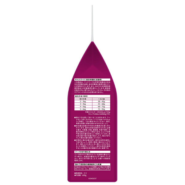 穀類(とうもろこし、とうもろこしたんぱく、米、小麦、オーツ麦等)、肉類(チキンミール等)、大豆粉、動物性油脂、食物繊維、たんぱく加水分解物、魚介類(まぐろ、かつお)、フレーバーブレンド(鯛、海藻等)、ミネラル類(カルシウム、リン、カリウム、ナトリウム、クロライド、鉄、銅、マンガン、亜鉛、ヨウ素、セレン)、ビタミン類(A、E、K、B1、B2、パントテン酸、ナイアシン、B6、葉酸、ビオチン、B12、コリン)、アミノ酸類(メチオニン、タウリン)、着色料(カラメル色素、カロテノイド色素)