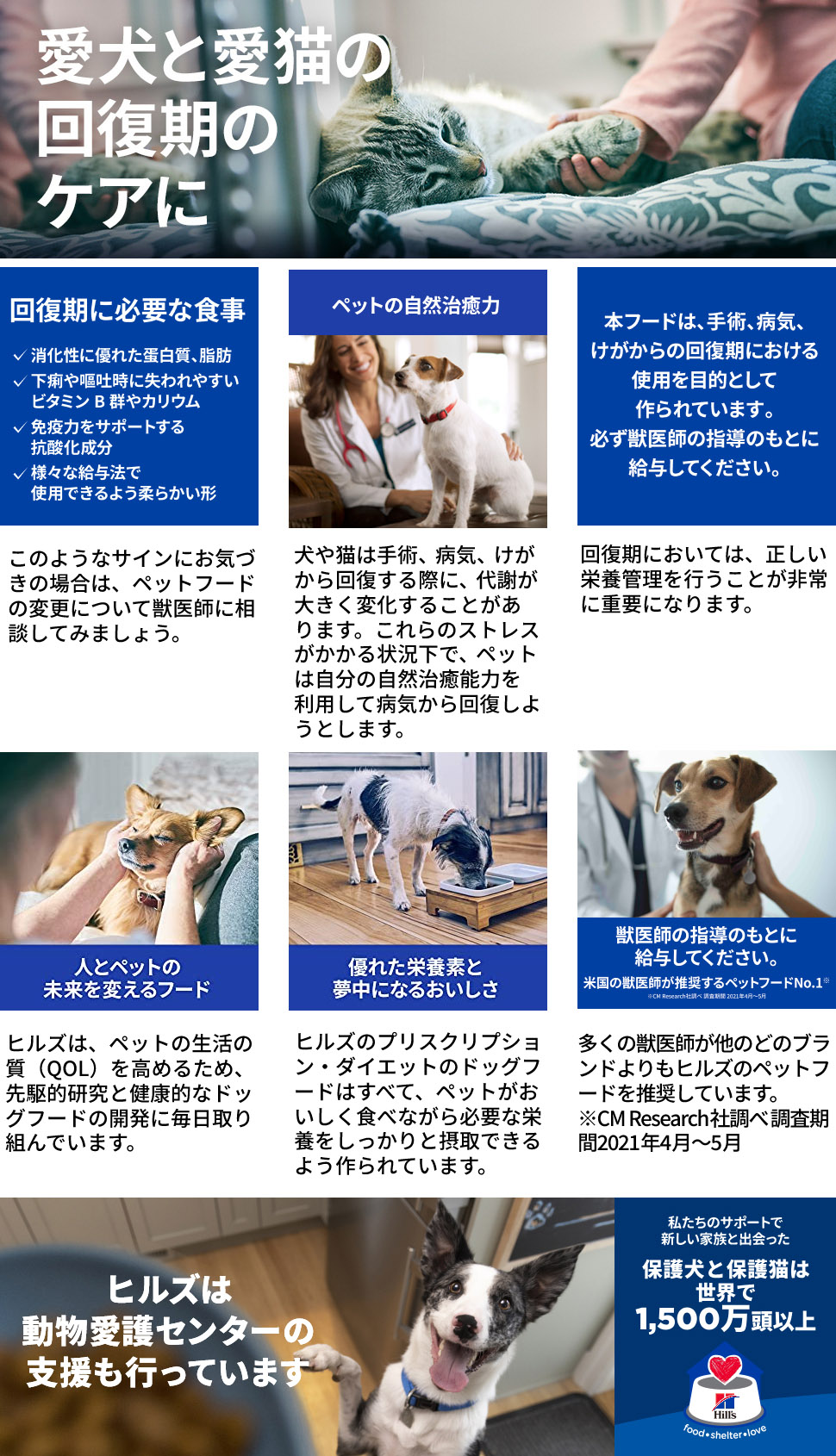 そんなペットのために、ヒルズの栄養学者と獣医師が開発したのが、高たんぱく質と高カロリーに調整し、病気や衰弱から回復期のケアに役立つことが科学的に証明された、特別療法食 プリスクリプション・ダイエット 犬猫用 a/dです。