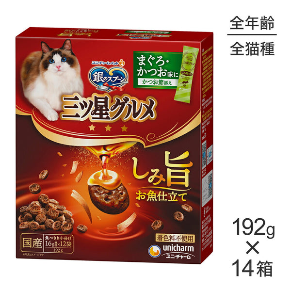 【192g×14箱】ユニ・チャーム 銀のスプーン 三ツ星グルメ しみ旨お魚仕立て 全年齢用 まぐろ・かつお味にかつお節添え (猫・キャット)