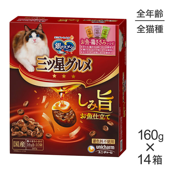 【160g×14箱】ユニ・チャーム 銀のスプーン 三ツ星グルメ しみ旨お魚仕立て 3種のアソート 全年齢用 お魚・鶏ささみレシピ (猫・キャット)